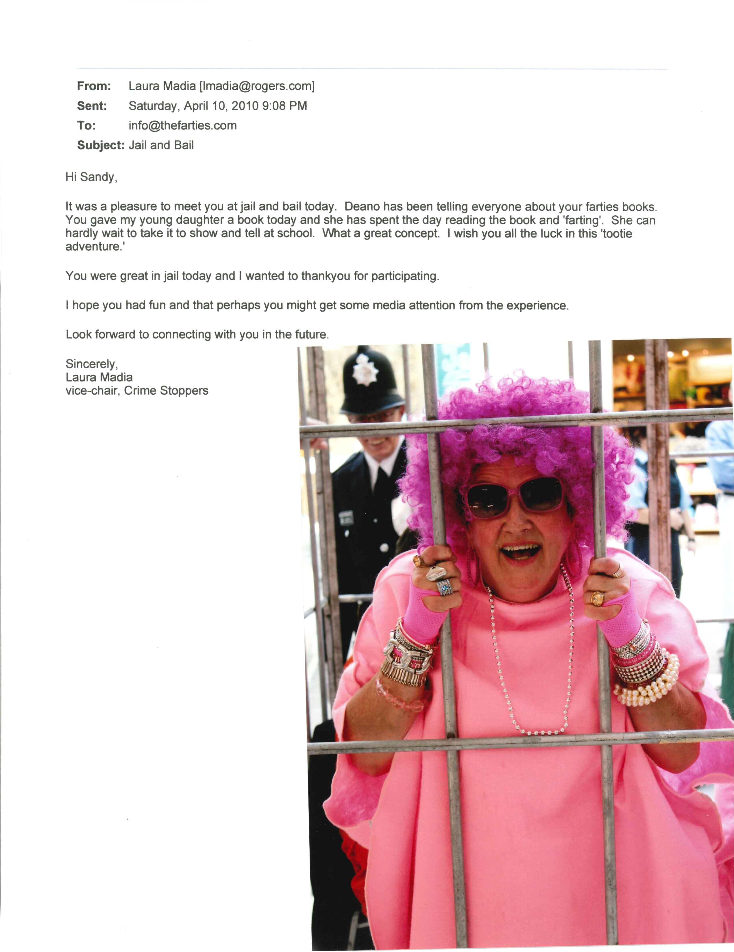 Thank goodness the wonderful people of Paris bailed out the Fartie Ladies and we didn’t have to spend too much time locked up. All in all it was a great cause and The Fartie Ladies read out book Meet the Farties and the judge just laughed and laughed, he finally said if he couldn’t stop laughing he would have to let us go. I guess he really enjoyed the giggles and he must be laughing to this day because we are free!